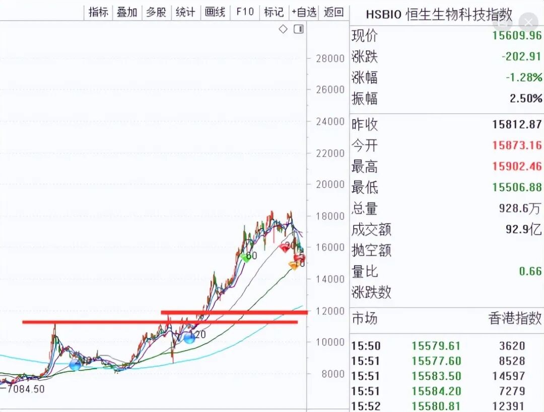 短线来说恒生生物科技指数,没量,下弯的均线是压力和拖拽,上扬的均线支撑薄弱