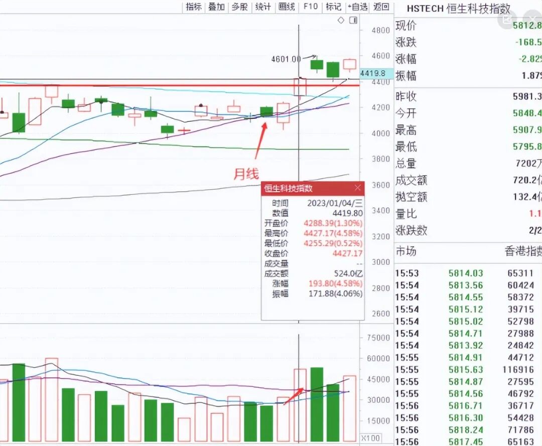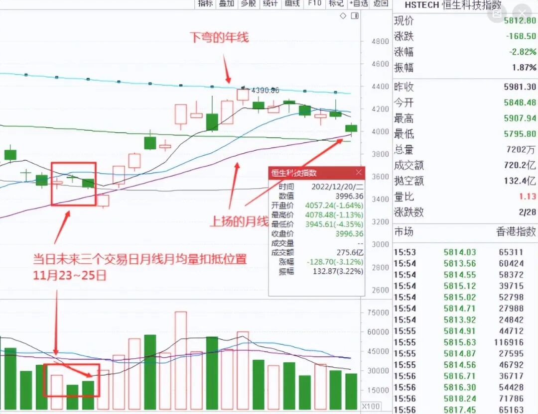 用多周期均线的共同影响这套理论,分析了当时的恒生科技指数