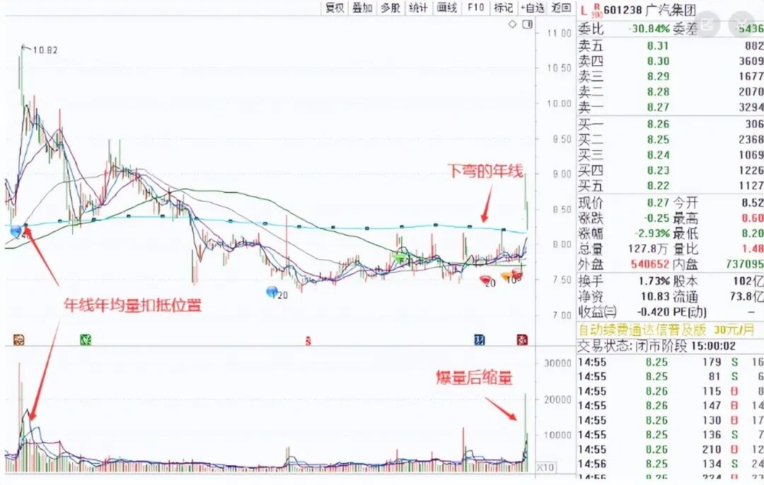 1.持续没量低于五日十日均量和扣抵量水平,那么很快就会开始下跌,并且上扬的年线也会短期被下弯的短周期均线压制而跌破,未来出量才会被上扬的年线拖拽回来