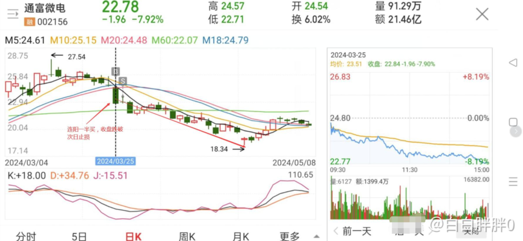 比如去年三月对于通富微电的操作(连阳一半买,收盘跌破次日止损)