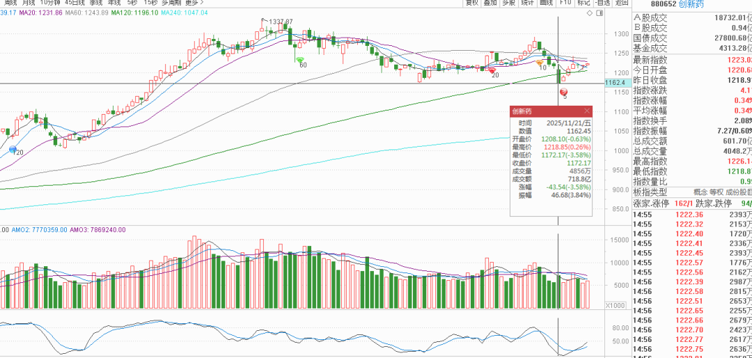 技术面上11月21日低点KD同步新低未背离,所以那一天创新药的低点1172.17大概率不是这波回调的最低点