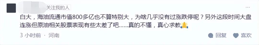 A股流通市值小,但是还有港股那边流通市值可是接近万亿港币啊,主力类型是国家队外资法人机构的大盘股,涨跌停这种事情对海油的股性来说,是小概率事件,但大概率,你能在今年出现戴维斯双击的时候见到,海油这里是“价值”投资,记得区别