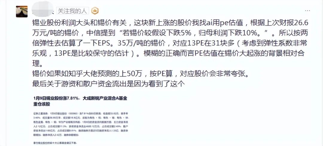 从我那天发的PB估值计算,现在锡业股份是明确高估的