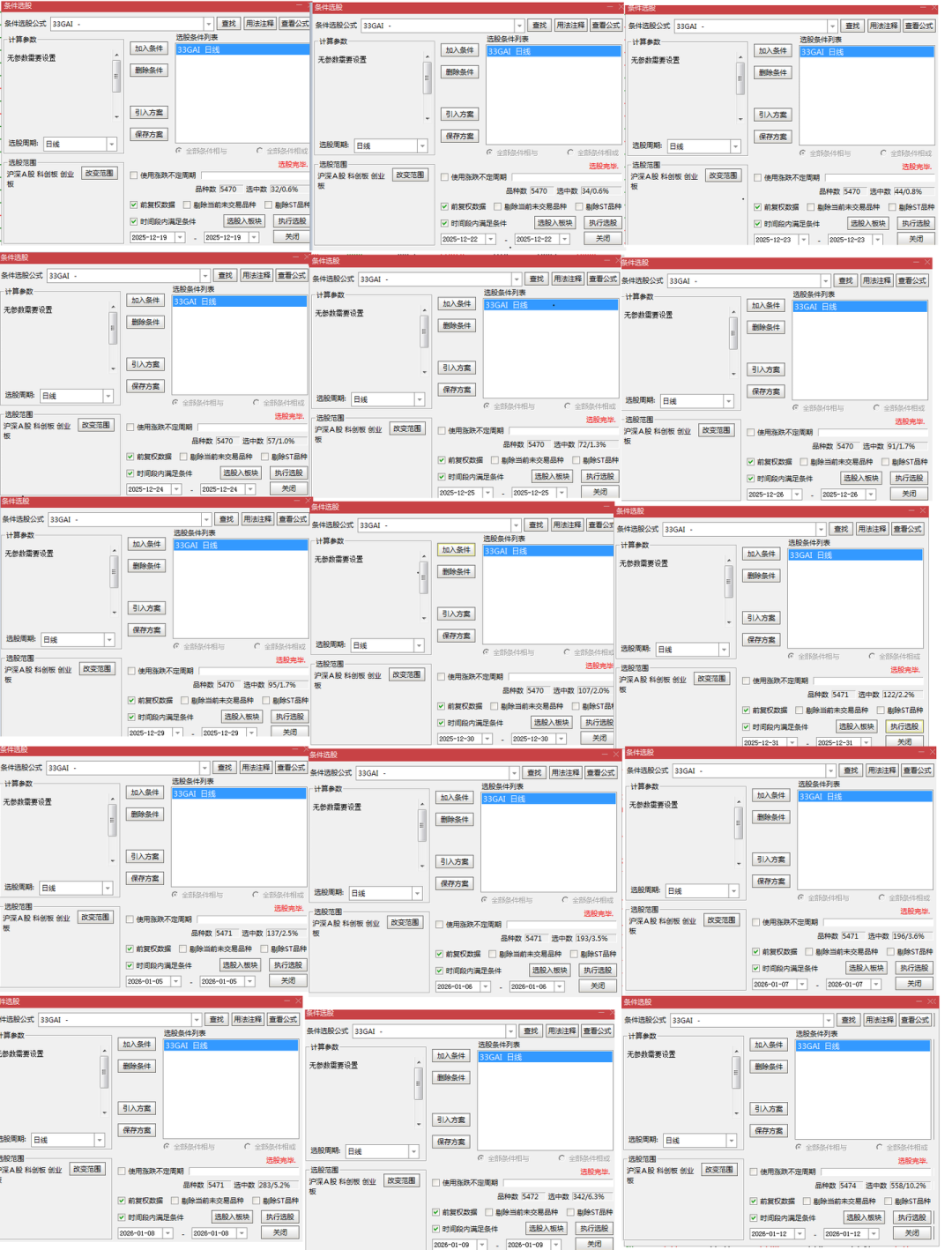 另外如同我修正篇的文章里所说,你不需要选出来观察,你直接找8,13,21天前是这个条件的股票就会是最近可能可以操作的标的